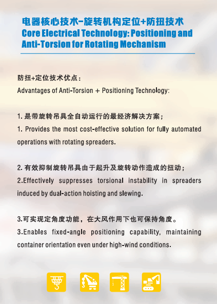 In the rapidly evolving landscape of industrial automation and material handling, the demand for precision, reliability, and efficiency continues to grow. Our core electrical technology—Positioning and Anti-Torsion for Rotating Mechanisms—represents a significant leap forward in addressing these challenges. Designed for seamless integration with rotating spreaders, this advanced system ensures unmatched operational stability, enabling fully automated and cost-effective solutions for industries worldwide.